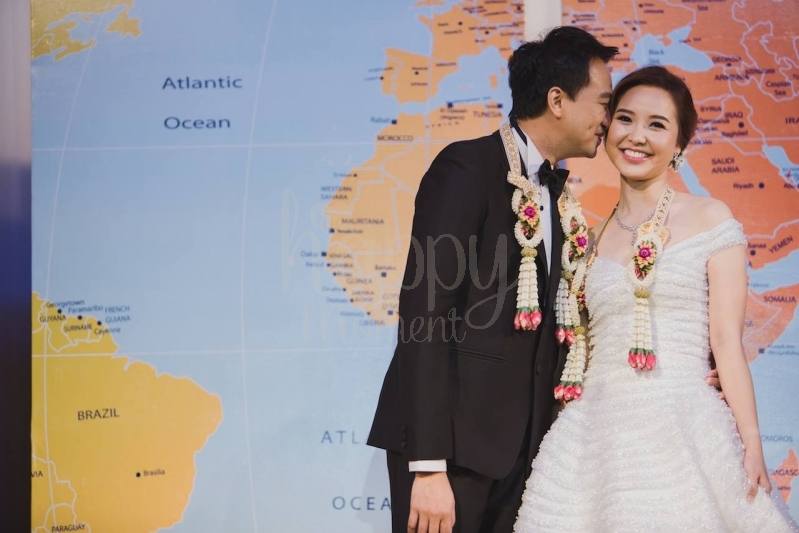 "เราสองคนอยากไปเที่ยวด้วยกัน" น้องต้อมและหมอนิพ ให้เหตุผลสั้นๆ หลังจากที่ทั้งคู่หาข้อมูลโปรโมชั่นสายการบินๆ หนึ่ง แล้วอยากจะใช้เวลาร่วมกันในการออกเดินทางไปที่ต่าง ๆ รอบโลก จนกลายมาเป็นที่มาของธีมงานนี้ งานเลียงน่ารักๆ สีสดใส ซึ่งเป็นสีที่ทั้งคู่เลือก จึงเกิดขึ้น แม้จะเป็นบรรยากาศ indoor แต่ด้วยคอนเซปของการตกแต่ง กับรอยยิ้มตาหยีของเจ้าบ่าวและเจ้าสาวที่แผ่กระจายควมสุขตลอดเวลา ทำให้งานดูอบอุ่น เป็นกันเองมากยิงขึ้น ทั้งคู่ปิดท้ายงานด้วยความเก๋ไก๋ กับพรีเซนเทชั่น ทีเ่ป็นพรีเซนเทชั่นจริงๆ ด้วยการขอบคุณแขกในงานผ่านพาวเวอร์พอยท์ประกอบการบรรยายของทั้งคู่ เชื่อว่าหลายๆ ท่านสนุกไปกับพรีเซนท์นี้ด้วยแน่นอน ทราบมาว่าหลังงานแต่งงานน้องต้อมและหมอนิพออกเดินทางกันอย่างสนุกสนาน ให้เราได้อิจฉาเล่น กับภาพการท่องเที่ยไปที่นั่นที่นี่ของทังคู่