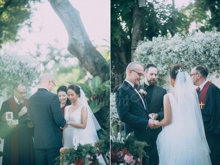 ทุกครั้งก่อนเริ่มงานเราจะบอกบ่าวสาวทุกคู่เสมอว่าให้ทำการบ้าน เตรียมสิ่งที่ชอบมาคุยกับเราจะได้เข้าใจเห็นภาพตรงกัน คุณกูนและคุณโดมินิก เลือกโทนสีฟ้า dusty bkue และสีแดง burgandy ที่ตรงข้ามกันแบบสีร้อนและเย็น และมี note เล็ก ๆ แจ้งเราด้วยว่าชอบดอกฟูๆ ขาวๆ อยากให้ทุกอย่างเข้ากับโลโก้ทรงแปดเหลี่ยมที่ดีไซน์ไว้ด้วยตัวหนังสือหวัดๆ ในงานจำเป็นต้องมีนักแปลภาษาและดำเนินพิธีแบบไทย อังกฤษและเยอรมัน เลยเป็นงานแรกของเราที่มีล่ามและหูฟังแจกผู้มาร่วมงานด้วย เป็นการเปิดมิติใหม่แห่งการรันคิวของพวกเราเลยทีเดียว :-) งานพิธีคริสต์ช่วงบ่ายที่แพกเกจของทางรร.ตกแต่งตามดีไซน์ของเราให้สวยหวานสะอาดตา แล้วปรับอารมณ์มาช่วงดินเนอร์ที่ต่อเนืองกันด้วยโทนสีตามธีมที่ดูเข้ากันและอบอุ่นด้วยแสงไฟดวงเล็กๆ มากมายในงาน ขอบคุณคุณกูนและคุณโดมินิกที่วางใจให้พวกเราดูแลงานที่อบอุ่นมาก ๆ แขกในงานหัวเราะและเสียน้ำตาเท่าไหร่ ทีมงานก็อินไปด้วยไม่แพ่กันเลยค่ะ ถึงจะผ่านมาหลายเดือน แต่พวกเราก็ยังจำคืนนั้นได้เสมอ ขอบคุณบ่าวสาวและครอบครัว และทุกฝ่ายอีกครั้งนะคะ